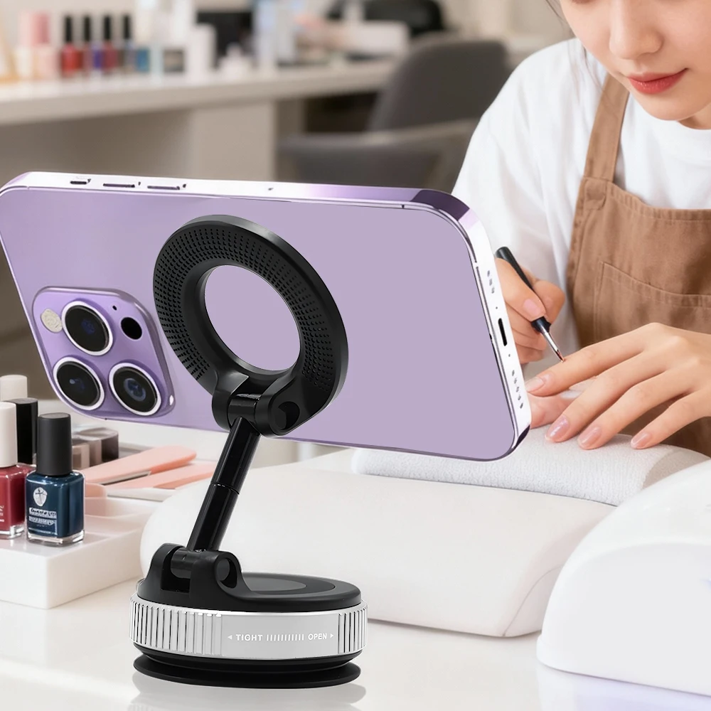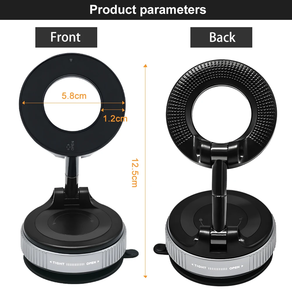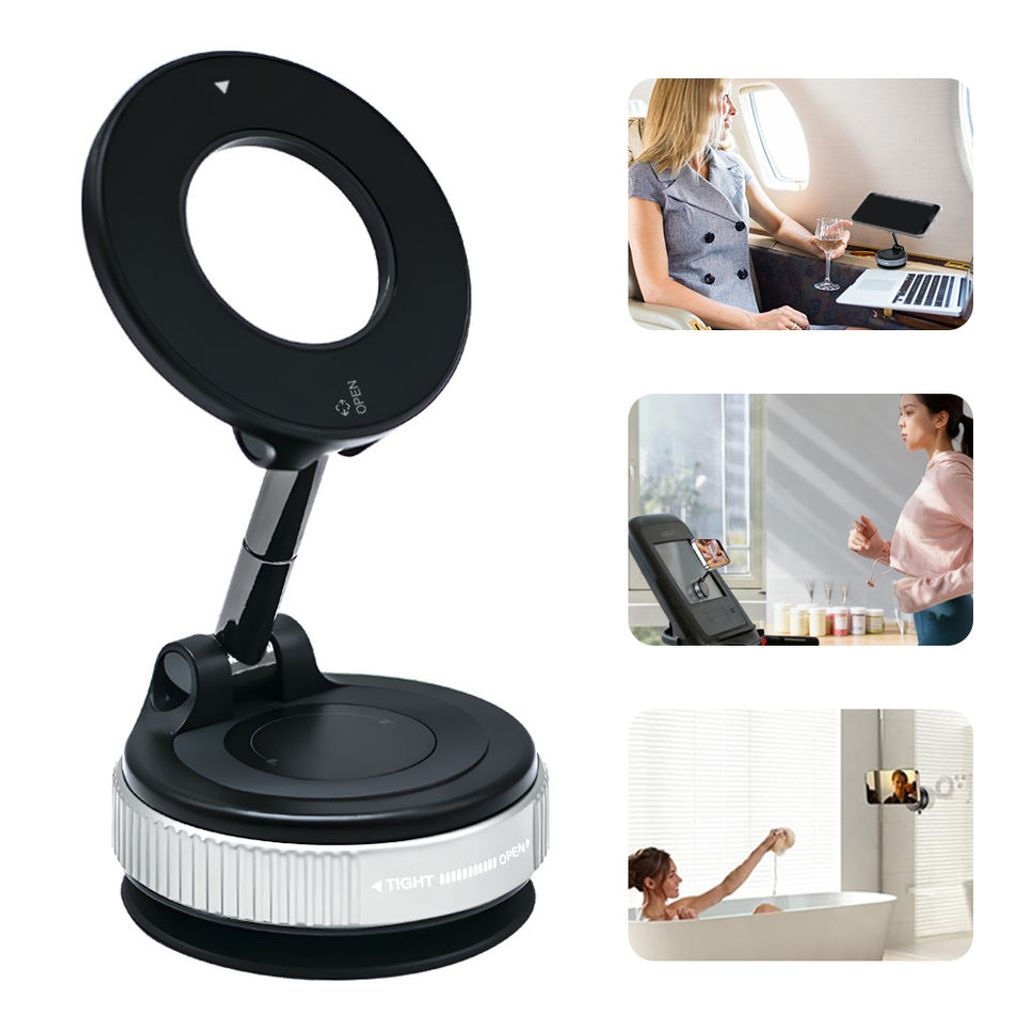 Features | * 【Dual Side Phone Holder】Both sides of the magnetic suction phone mount can be used. The Vacuum Side applies to mirrors, glass, ceramic tile, car screens, and perfectly smooth surfaces; The Magnetic Side functions on iron surfaces like fitness equipment and treadmill. * 【Strong Vacuum Suction】The suction cup phone holder employs an innovative vacuum suction technology. Only need to gently press to start pumping, it can be perfectly adsorbed on the smooth surface, If you need to remove it, just press the side release button. * 【Compatible Range】 This magnetic suction phone mount can place directly to Phone 16/15/14/13/12 Pro series (The mobile phone case will affect the magnetic effect, it is recommended to attach a magnetic ring to the mobile phone case). For the non-Magnetic phone, we provide to metal magnetic rings for your cell phone. * 【Portable Magnetic Suction Phone Mount】The vacuum suction design doesn't leave a trace on the surface of the car, screen or elsewhere, and you can also take it anywhere you want to go, suitable for for driving, fitness, cooking, watching video and makeup etc. |